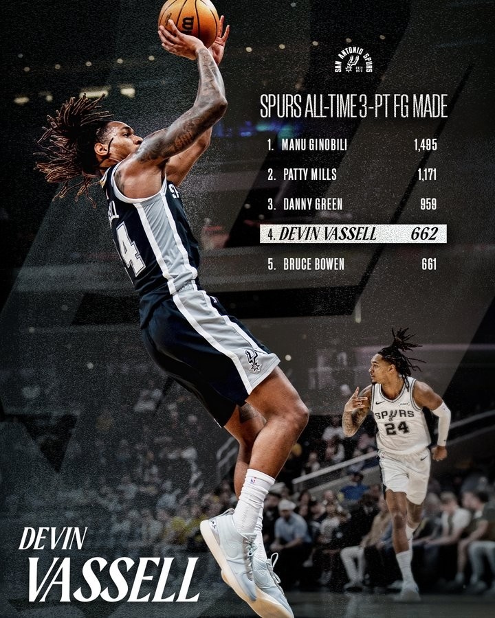 里程碑!瓦塞尔马刺队史三分数超越鲍文 升至第四位