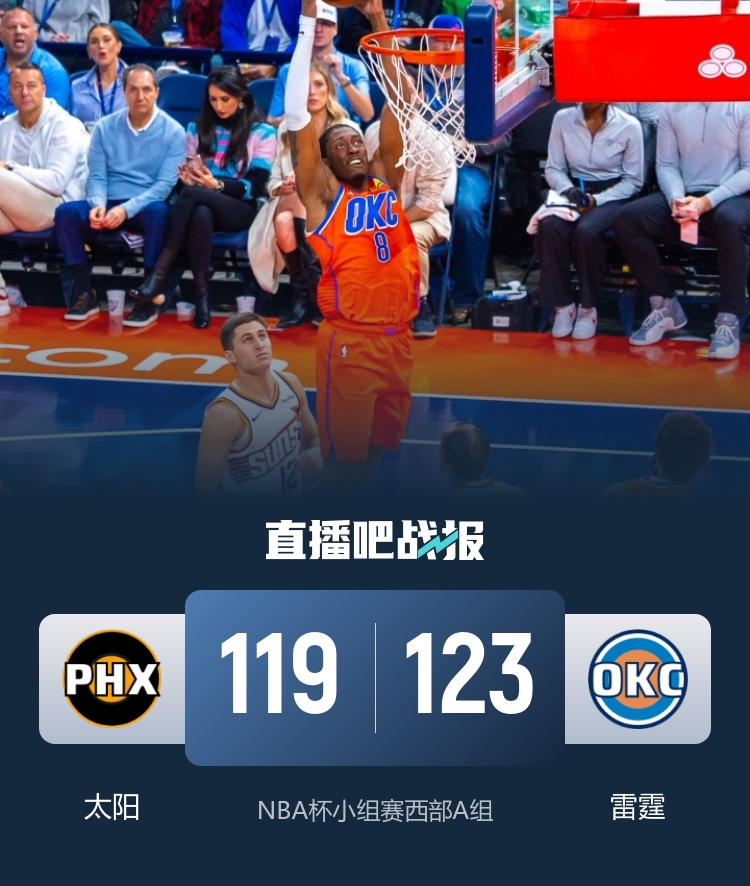 首节开打后双方稍显慢热,布克连投带罚率先发力,雷霆内外结合及时回应,首节结束时两队战成25平,次节回来,亚历山大一扫颓势连续取分,切特外线续上火力,杰伦·威廉姆斯专注串联,三人联手率队逐渐占优,半场战罢,雷霆领先4分。易边再战后雷霆连造杀伤一波10-2拉开比分,末段雷霆连中三分牢牢占优,三节结束后雷霆已经领先12分,末节上来,太阳连中三分拉回悬念,亚历山大开启杀神模式予取予求,狄龙错失绝平三分,亚历山大两罚全中后太阳反扑未果,最终雷霆123-119力克对手,小组赛4胜0负头名出线。