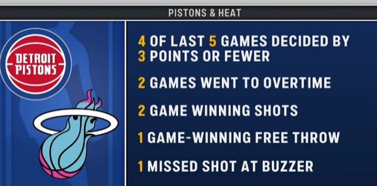 激烈!热火VS活塞过去五场四次分差3分以内 两次绝杀一次罚球绝杀