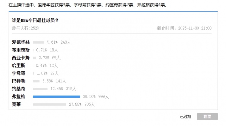 在主播评选中,爱德华兹获得3票,字母哥获得1票,约基奇获得2票,弗拉格获得4票。