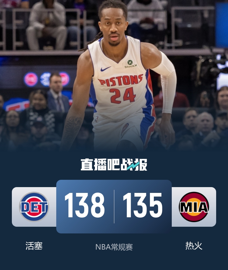 此役一上来两队迅速陷入缠斗,康宁汉姆里突外投,邓肯·罗宾逊面对旧主连中三分,热火多点开花紧咬比分,但末段热火进攻断电,活塞一波13-0确立13分优势,次节回来,热火状态复苏回敬12-0攻击波,康宁汉姆延续火力稳住局势,半场战罢,活塞依然领先12分。易边再战后两队继续对攻,活塞稳扎稳打牢牢占优,三节结束后活塞已经领先17分,末节上来,活塞一度将分差拉开到20分,热火绝境13-0拉回悬念,詹金斯关键上篮止血,康宁汉姆一攻一防杀死比赛,最终活塞138-135力克对手终结连败,同时终结热火6连胜。