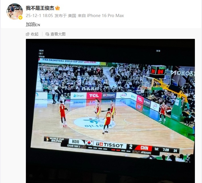 直播吧12月1日讯 男篮世亚预阶段一中国男篮再战韩国男篮,在美国的王俊杰更新动态,晒出观看比赛的视频。