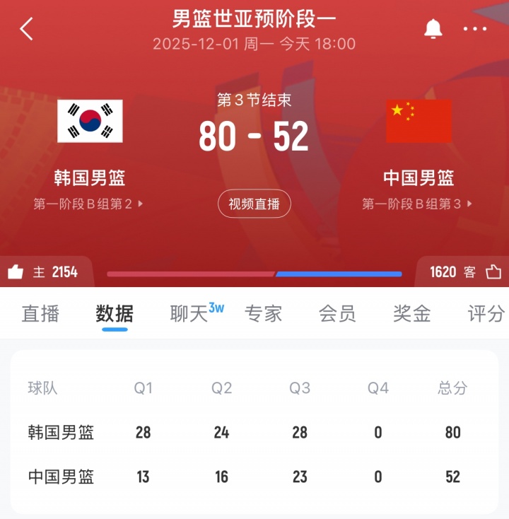 越来越惨!韩国男篮三节砍80分 已追平上一场全场得分