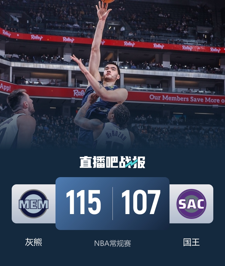 首节开打后两队迅速进入状态,埃迪强吃内线连续打进,韦尔斯和斯潘塞连中三分,末段国王回敬14-2攻击波,首节结束时国王领先4分,次节回来,埃迪威力不减予取予求,德罗赞联手蒙克短暂回应,半场战罢,灰熊反超3分。短暂休整后国王进攻断电,灰熊顺势轰出10-0拉开比分,德罗赞和蒙克得分接力一波17-3再度反超,国王领先4分进入末节,末节决战,灰熊率先发力11-0夺回优势,国王迅速回应12-2抹平分差,决胜时刻埃迪制霸内线终结悬念,最终灰熊115-107击败对手迎来三连胜,同时送给国王三连败。