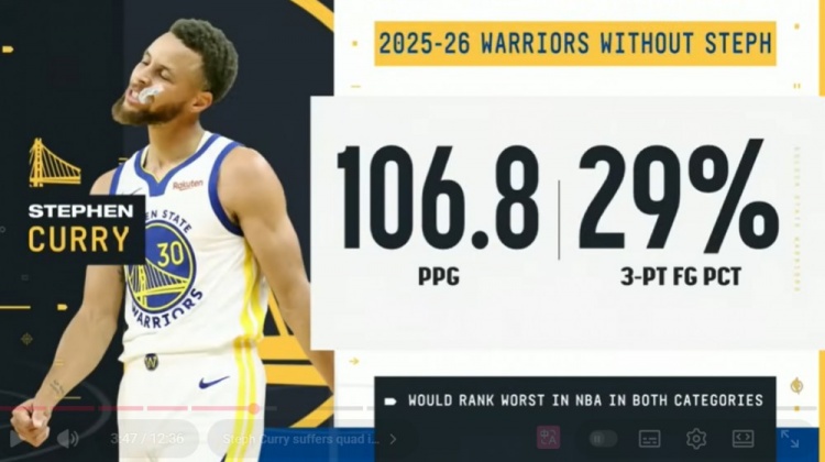 >本赛季库里缺席勇士场均106.8分&三分命中率29% 均为联盟最差!