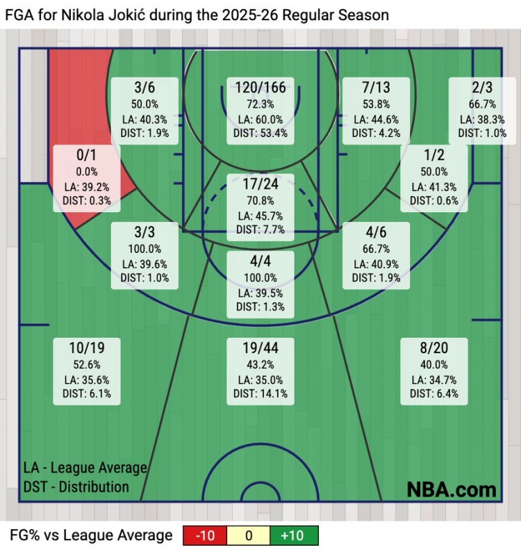 >夸张!约基奇赛季至今投篮热图:几乎全区域为绿 油漆区产效惊人
