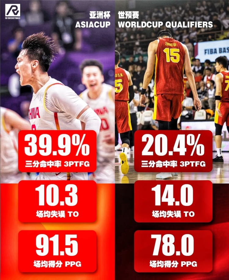 亚洲杯期间,中国男篮场均轰下91.5分,三分命中率39.9%,场均仅10.3个失误;世预赛两战韩国,男篮场均78.0分,三分命中率20.4%,出现14个失误。