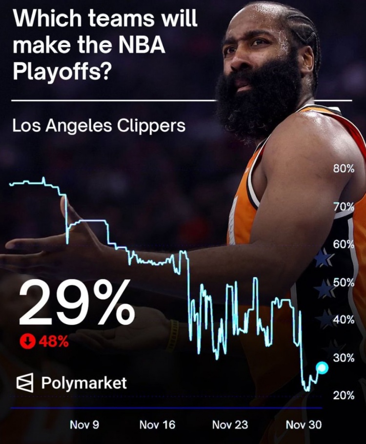 本场比赛过后,快船以5胜16负排在西部倒二,他们能打进季后赛的概率由赛季开始的77%降至29%。