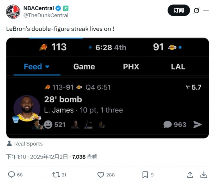 詹姆斯得分上双!美媒庆祝:詹姆斯的得分上双纪录保住了!