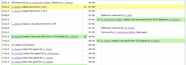 本场比赛末节詹姆斯得到4分,最后6分51秒詹姆斯命中三分得分上双,随后5分44秒湖人换下全部主力。