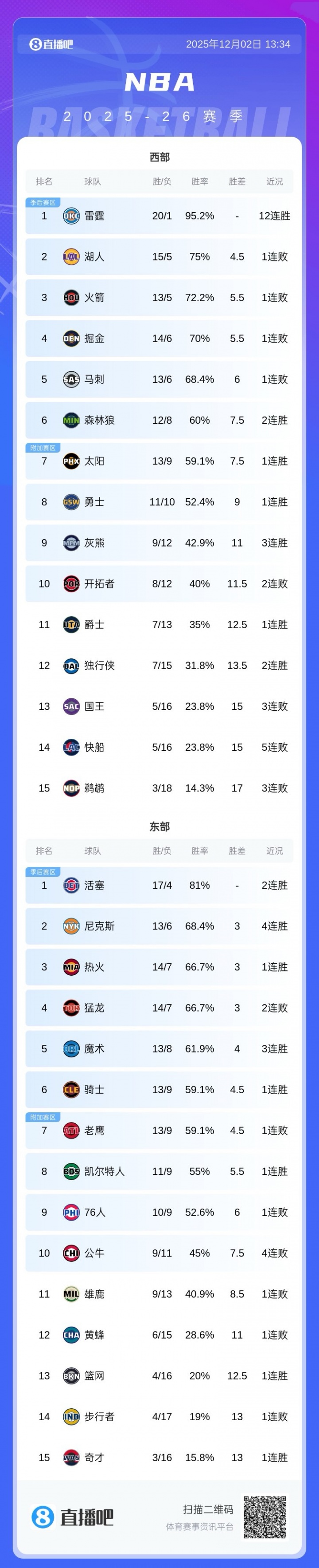 西部第一的雷霆仍12连胜,第六的森林狼保持2连胜。