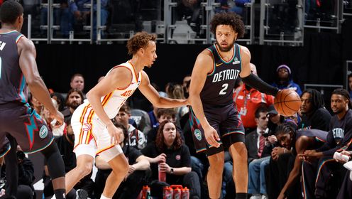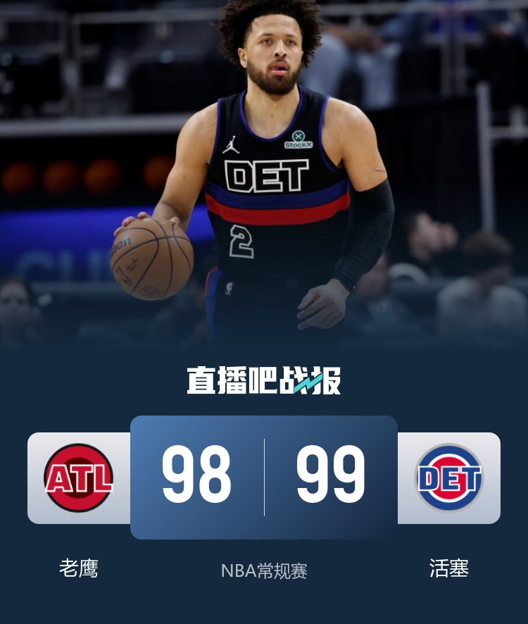 一开场,两队很快陷入缠斗,比分交替领先,杜伦强攻打2+1,老鹰外线开炮迅速回应,奥孔武高效输出,勒韦尔2记三分还以颜色,次节两队依旧打得难解难分,霍兰内外开花,老鹰连投带罚顽强咬住,半场战罢活塞50-49领先老鹰1分。下半场,杰伦·约翰逊状态回暖,内外开花单节独得13分,但活塞凭借一波8-0的攻势取得领先,末节沃克连得8分,活塞突然发力打出11-0的攻击波,老鹰连中三分迅速抹平分差,关键时刻康宁汉姆连中两球,老鹰苦苦追赶无果。最终,活塞99-98力克老鹰,主场过关。