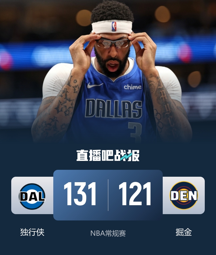 独行侠(7-15):戴维斯32分13板4助2帽、内姆哈德28分3板10助、弗拉格24分8板2助2断、克莱15分5板1助、马绍尔9分7板6助、克里斯蒂9分2板1助、拉塞尔8分2助、鲍威尔4分2板4助、威廉姆斯2分1板4助、马丁2板1助