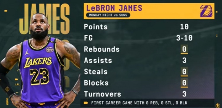 詹姆斯昨日对阵太阳全场0篮板0抢断0盖帽 职业生涯首次!