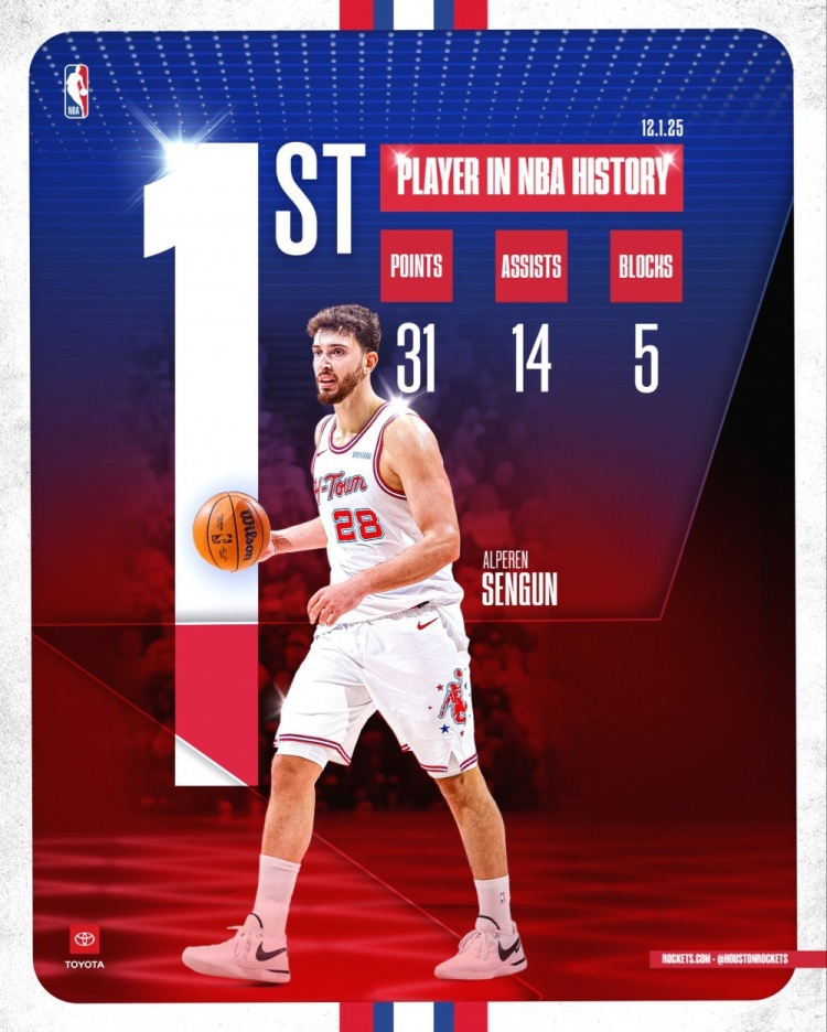 今天火箭官方晒出数据显示,申京是NBA历史上首位单场砍下至少30分14助攻5盖帽的球员。