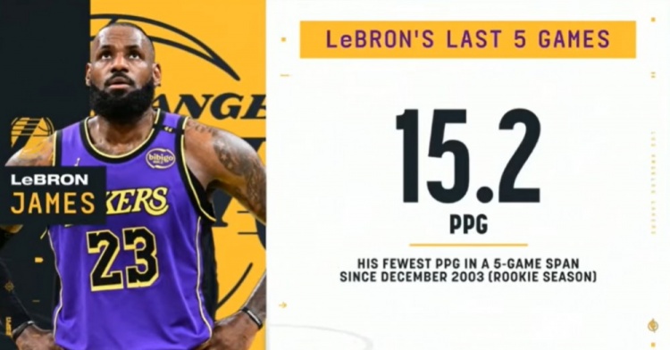 >打法变了也确实老了!詹姆斯近5场场均15.2分 新秀赛季以来最低