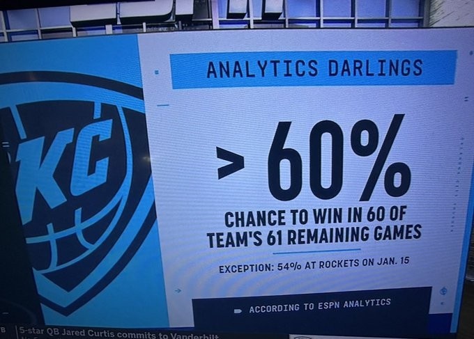 ESPN数据分析系统对本赛季剩余赛程的胜率预测,其中61场比赛的胜率超过60%。
