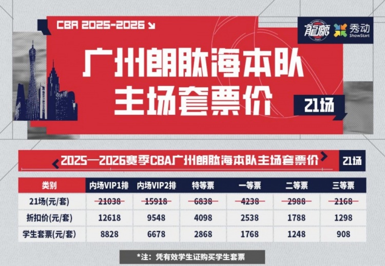 球迷朋友们可以通过 “秀动” 平台购买套票,锁定21个主场的精彩,让我们继续以城市之名,为荣耀而战,共同见证广州朗肽海本队的每一次突破与辉煌!