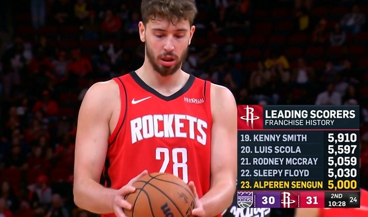 火箭主场迎战国王,第二节罚球时申京生涯得分破5000。