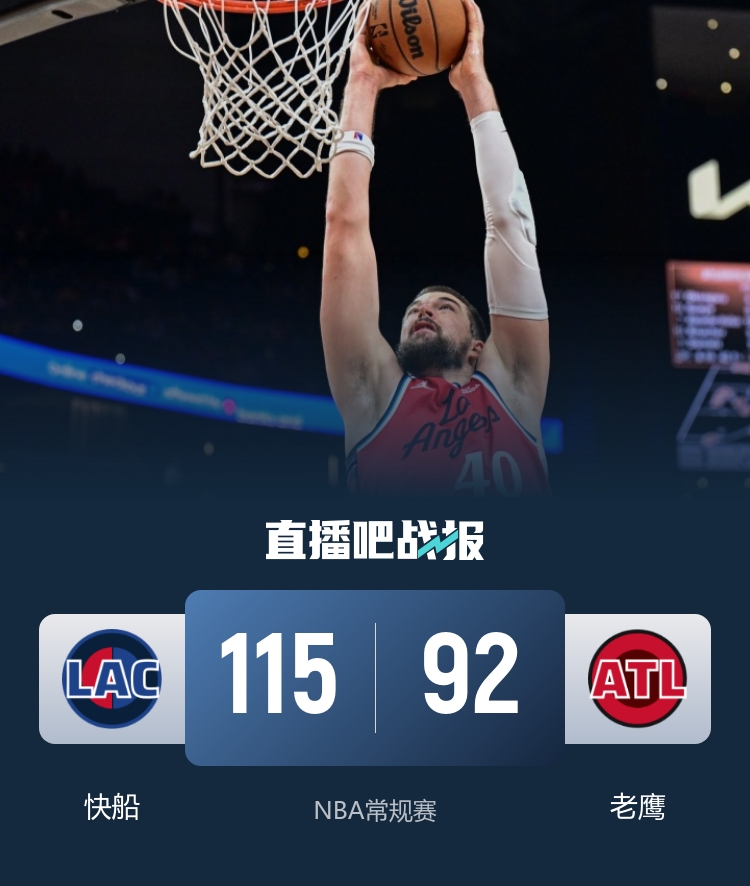 快船(6-16):哈登27分4板9助3断、莱昂纳德21分6板5助2断、桑德斯17分3板4助、科林斯15分9板1助2断、祖巴茨14分17板5助、邓恩8分2助2断、巴图姆6分3板2助、克里斯蒂4分5板、布朗3分5板1助、尼德豪泽2板