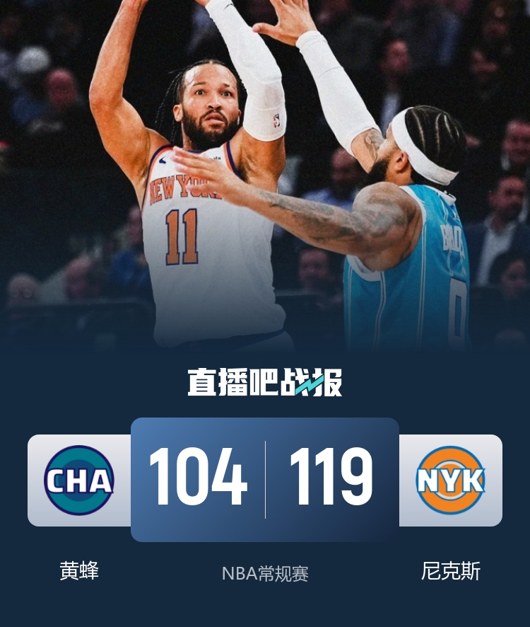 比赛上来,尼克斯就完全压制了对手,尤其是防守端让黄蜂首节仅拿到12分,他们建立起15分的优势进入次节,随着黄蜂找回进攻感觉,尼克斯的优势也被迅速蚕食,分差最小时仅剩3分,半场结束时尼克斯还领先6分;下半场回来,尼克斯重新占据场上主动权,分差也是再次回到十分以上,末节唐斯连续得分,尼克斯再打一波7-0的小高潮,分差直接突破20分,比赛也是彻底失去悬念,最终尼克斯轻取黄蜂拒绝连败。