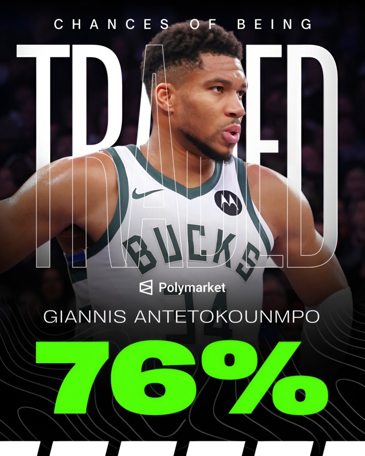 直播吧12月05日讯 据美媒Polymarket估算,字母哥有76%的概率被雄鹿交易走。