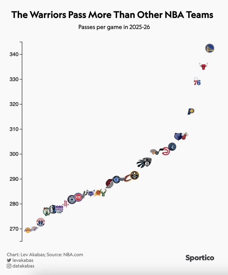 勇士本赛季场均传球次数联盟最多但进攻效率第23 湖人最少&第7