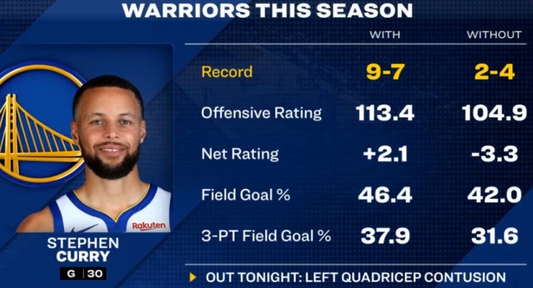 转播方给出一组数据,本赛季库里在场时勇士9胜7负,进攻效率113.4,净效率+2.1,投篮命中率46.4%,三分命中率37.9%;