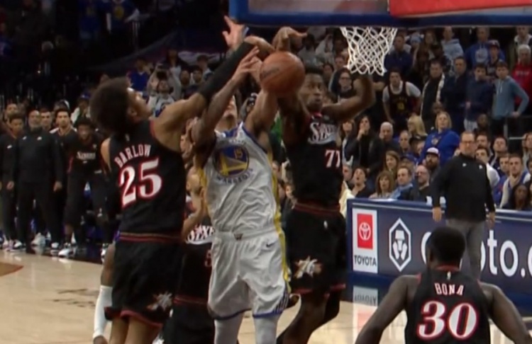 >关键判罚!梅尔顿上篮不中球出界判给76人 勇士挑战成功