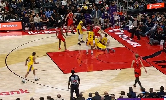 >拼劲十足!拉拉维亚倒地拼抢拿到球权 随即紧急叫停