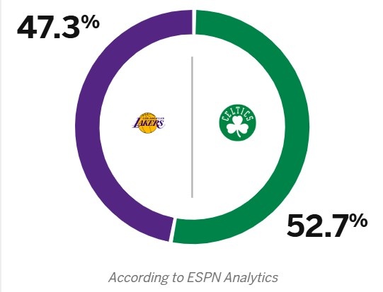 ESPN预测本场比赛胜率,湖人47.3%占据下风,凯尔特人52.7%。