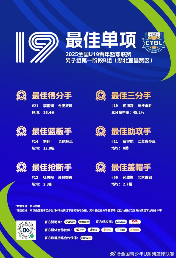 2025年U19联赛男子组第一阶段比赛已于11月30日结束,三大赛区(江苏连云港A组、甘肃嘉峪关A组、湖北宜昌B组)的最佳阵容及单项榜单正式公布👇