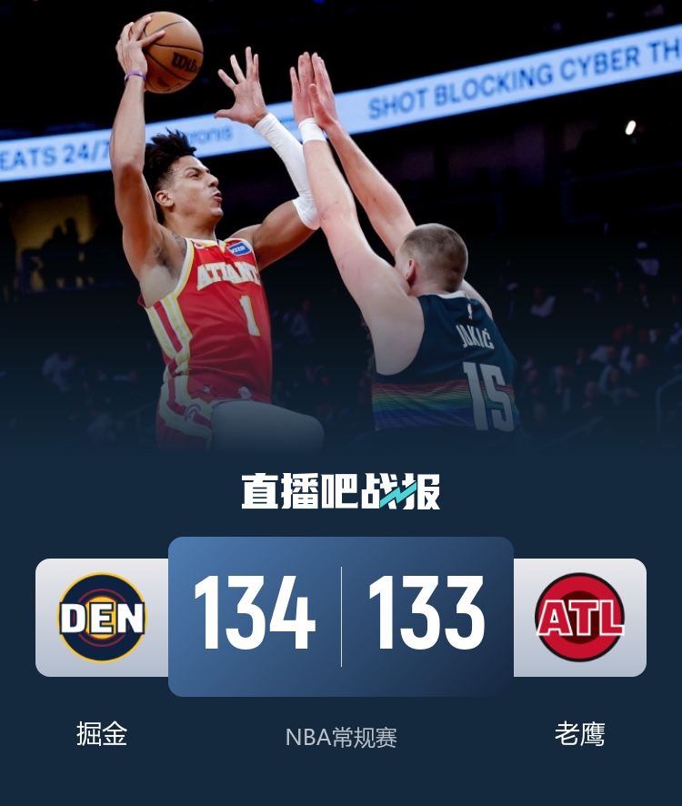 一开场,双方短暂相持,老鹰外线开火连中4记三分取得两位数优势,约基奇状态不佳,老鹰持续发力不断扩大领先,分差来到20分以上,次节老鹰火力不减,连续飙中三分保持大比分领先,掘金不断冲击内线连投带罚苦苦支撑,半场战罢老鹰73-54领先掘金。下半场,掘金大举反击,攻防发力轰出19-4的进攻高潮迅速迫近比分,末节老鹰彻底哑火,掘金打出20-0的攻击波强势反超,老鹰及时回暖,内外开花追到2分,关键时刻约基奇两罚一中,老鹰绝平三分不中,沃克上篮得手但时间来不及了。最终,掘金23分逆转,以134-133险胜老鹰。