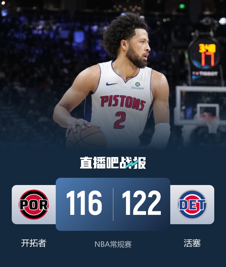 直播吧12月6日讯 NBA常规赛,开拓者对阵活塞,开拓者上场比赛击败骑士结束连败,杨瀚森本场比赛未被召回,活塞上场不敌雄鹿。