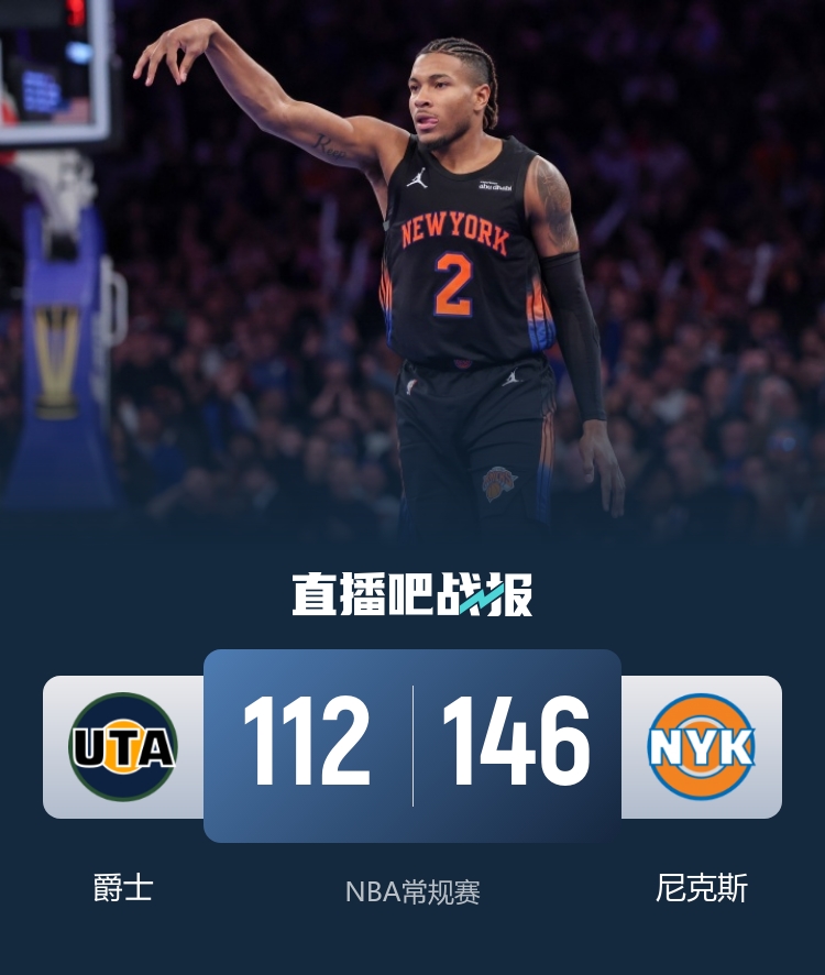 比赛上来,尼克斯就完全压制力对手,他们在不到6分钟的时间里轰出23-0的完美开局,整个第一节爵士只拿到13分,次节爵士的进攻明显好转,不过由于此前分差过大,半场结束时尼克斯仍领先21分;下半场回来,尼克斯继续占据场上主动权,拉锯过后分差继续突破三十分,比赛在末节早已失去悬念,最终尼克斯大胜爵士迎来连胜。