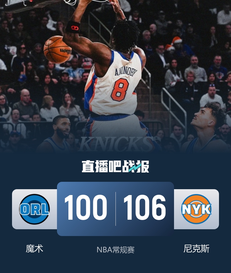 直播吧12月8日讯 NBA常规赛继续进行,尼克斯坐镇主场迎战魔术,此前尼克斯15胜7负位列东部第二,魔术则是14胜9负排名东部第五,此役唐斯缺阵。