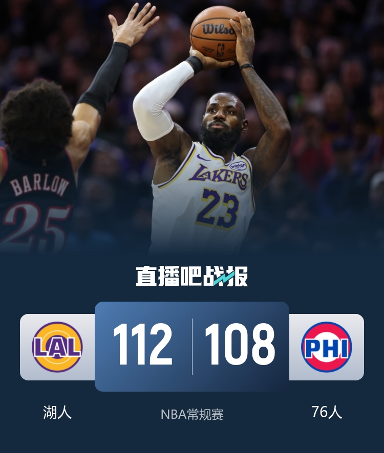 首节开打后马克西率先发难单节独得10分,东契奇buff拉满连投带传,詹姆斯反击暴扣技惊四座,艾顿和八村塁内外结合,湖人多点开花填补两位数大坑,首节结束两队战成30平,次节回来,恩比德手感不佳只能造杀伤取分,但湖人进攻同样滞涩,里夫斯联手东契奇苦苦支撑,半场战罢,76人确立7分优势。短暂休整后湖人找回进攻感觉,一波13-4后来居上,东契奇全能发挥三节砍下准三双,三节结束后湖人反超3分,末节决战,詹姆斯无人可挡连拿10分,马克西三分保留悬念,东契奇两罚稳稳命中,詹姆斯致命抢断杀死比赛,最终湖人112-108力克对手,反超掘金重返西部第2。