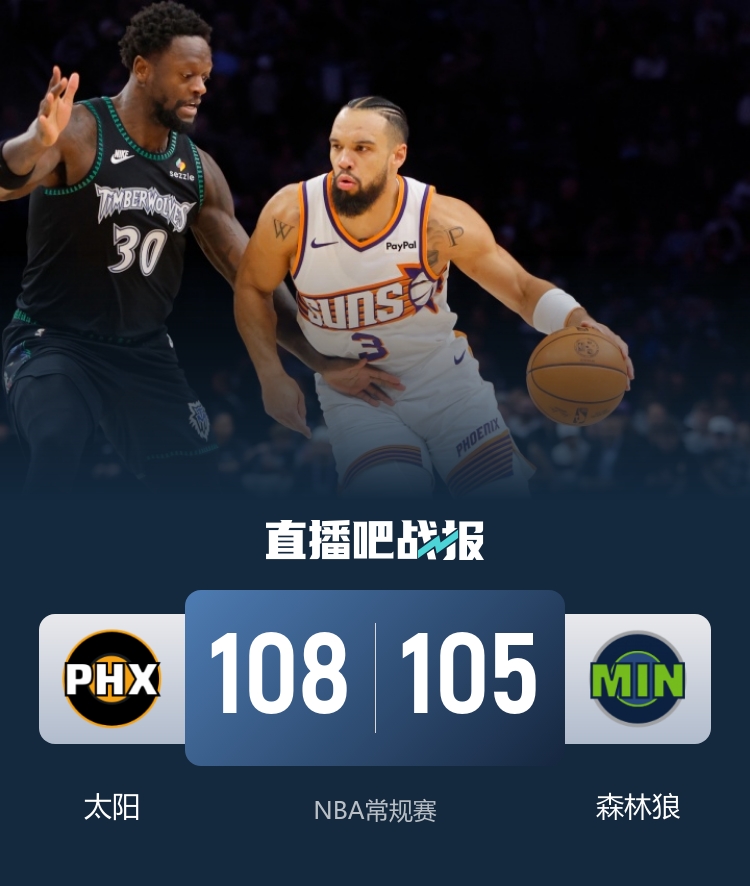 直播吧12月9日讯 NBA常规赛,森林狼今日迎战太阳,前者近来势头不错取得五连胜,后者上场比赛不敌火箭,此役布克和杰伦•格林缺战,狄龙和爱德华兹能打。