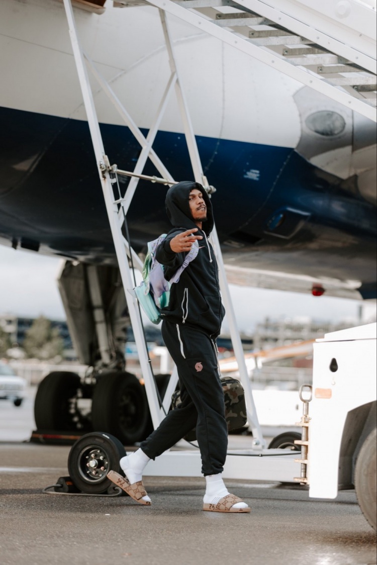 >明日战鹈鹕出战成疑!开拓者登机照:杨瀚森迷彩裤+黑夹克+小粉包
