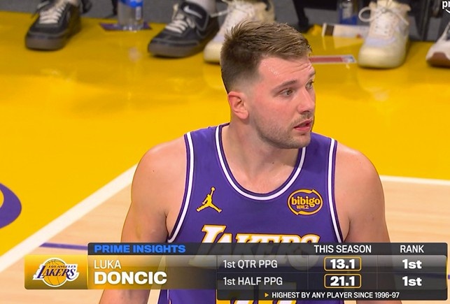 湖人VS马刺,转播方晒出统计,东契奇场均首节13.1分&上半场21.1分,都是有统计(96-97赛季)以来的最高。