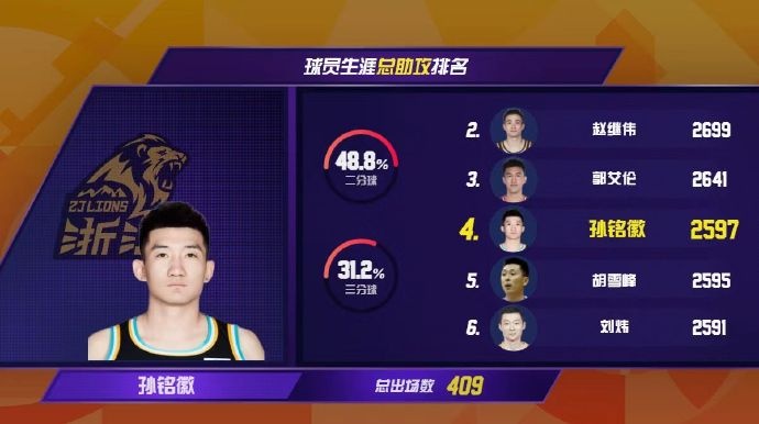 此役过后,孙铭徽CBA生涯总助攻达到2597次,超越胡雪峰来到CBA历史助攻榜第四位。