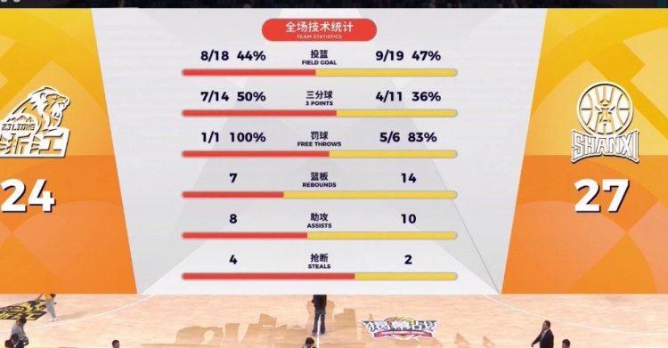 比赛开始,秦子龙先进三分,山西5-0开局,但赵岩昊三分回应助广厦咬住,随后赵岩昊和秦子龙又各自命中三分,双方比分拉锯,上半节山西领先4分。下半节,王欣瑞连中3记三分,广厦外线连发5炮反超比分,但山西一波6-0杀死比赛,最终山西27-24战胜广厦。