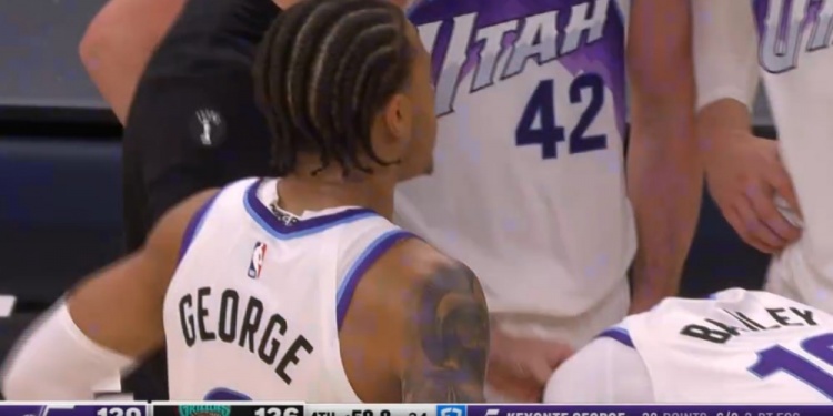 >关键球!基昂特·乔治拧着身子失衡出手 踩线两分稳稳飙进