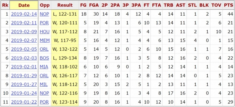 2019年1月到2月,威少曾连续11场砍下三双,其中包括一场44分14篮板11助攻。