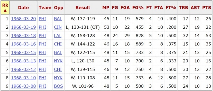 1968年3月,张伯伦曾连续9场三双,其中包括一场53分32篮板14助攻。