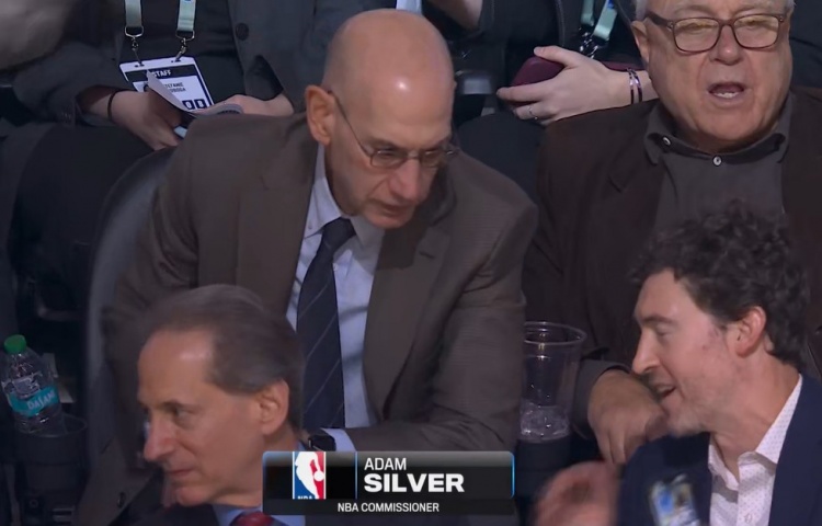 又在讨论什么呢?萧华观战尼克斯&魔术比赛 与邻座低头交流