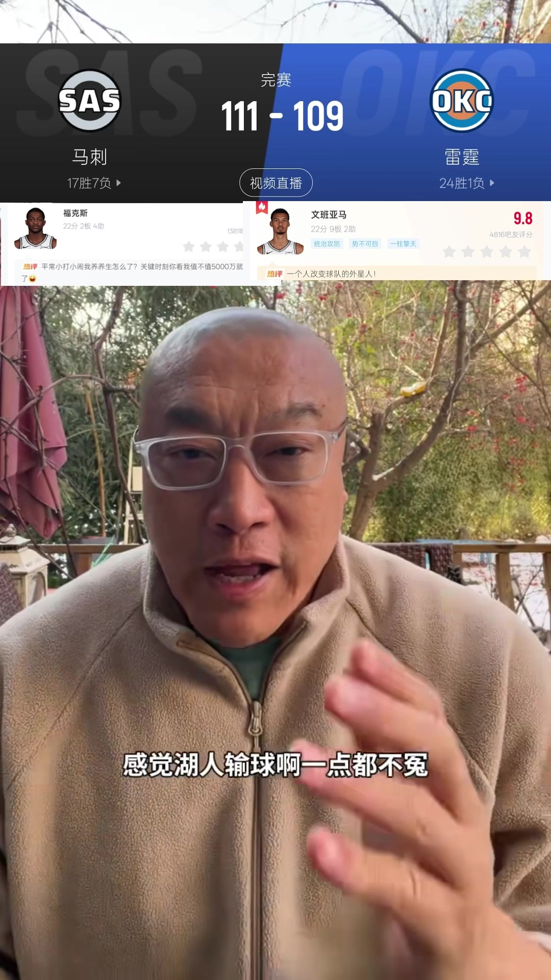 >马健:看完马刺的状态感觉湖人输球不冤 文班的天赋湖人无法匹配