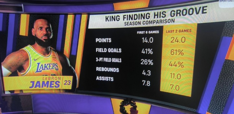詹姆斯赛季前6战场均14分 近两战场均24分11板7助&命中率大幅回升