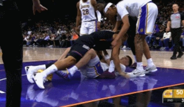 >注意影响啊!狄龙与拉拉维亚篮下争球倒地纠缠