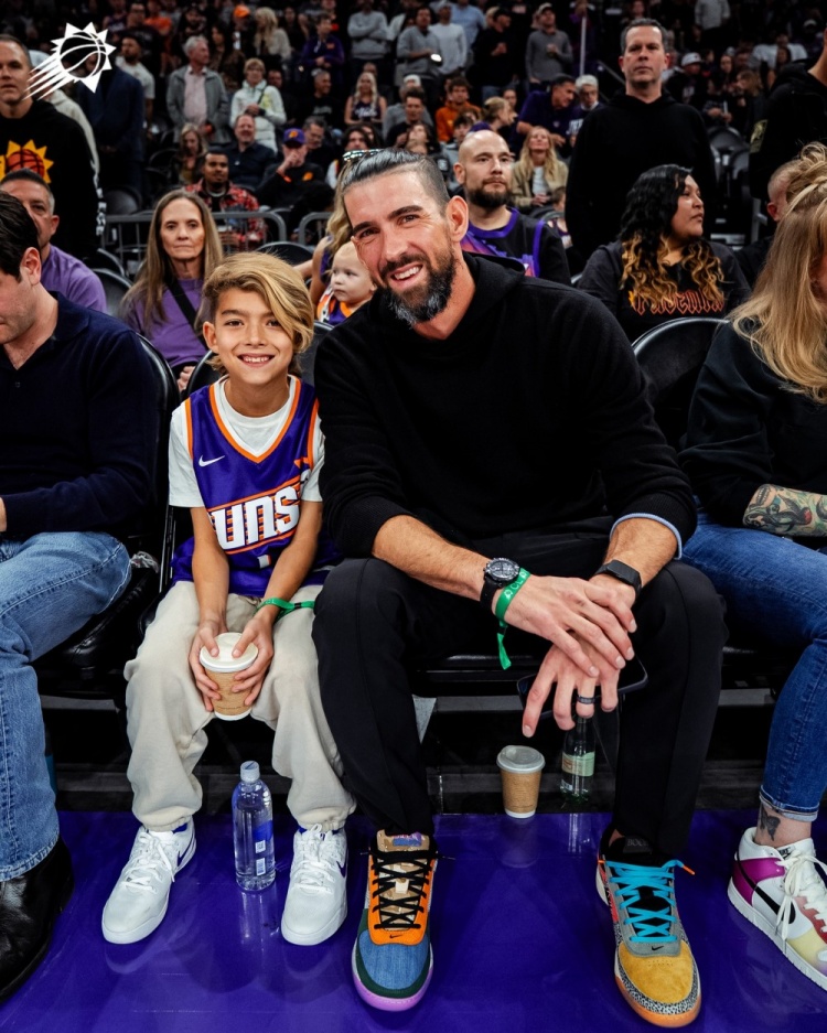23枚奥运金牌得主菲尔普斯观战湖人VS太阳比赛!脚穿布克签名鞋!